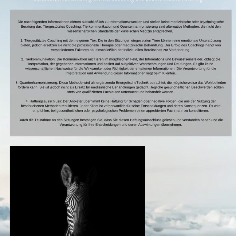 Die energetische Begleitung versteht sich dabei nicht als Ersatz für Training, Coaching oder einer tierärtzlichen Behandlung! Sondern als ergänzende Möglichkeit, das Tier und seine Situation aus einer weiteren Perspektive wahrezunehmen und Ganzheitlich zu betrachten, sowie Zusammenhänge anders zu beleuchten.